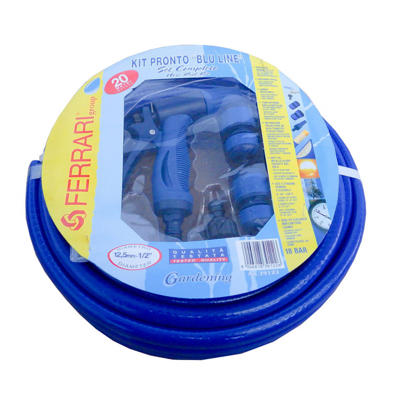 Kit tubo acqua retinato lunghezza mt 20 (mm Ø 14x16), completo di presa rubinetto da 3/4, raccordo rapido standard da 1/2 , raccordo rapido con arresto del flusso e pistola a getto regolabile