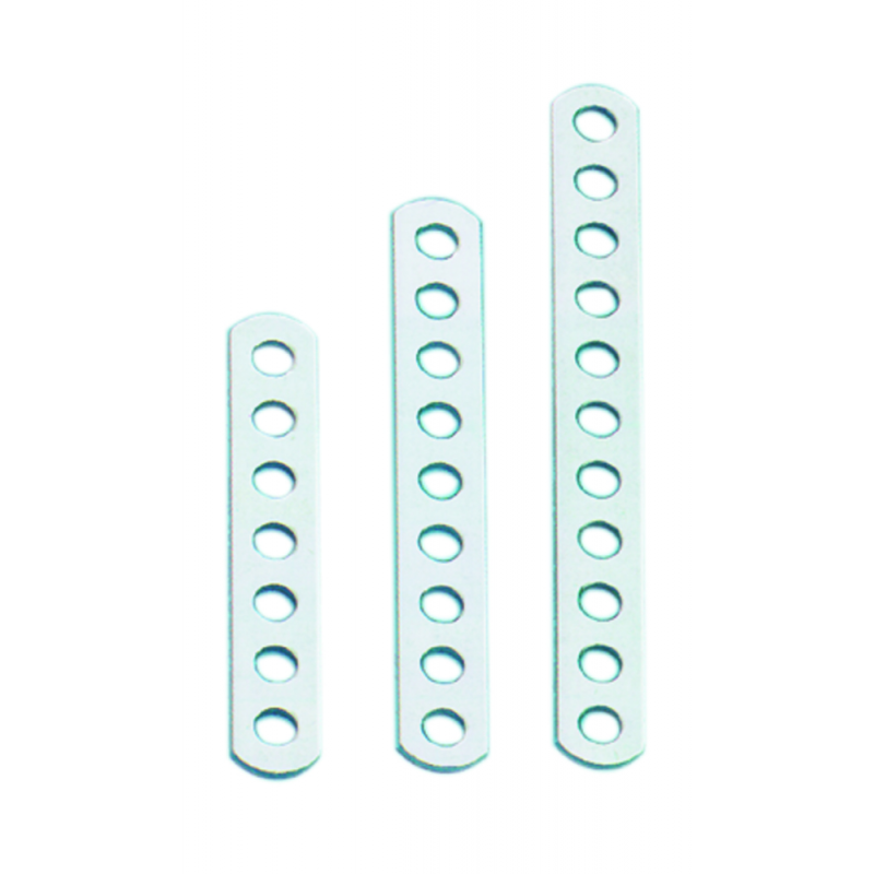 Landa forata in acciaio inox AISI 316. Dimensioni: Larg 14 mm. , Spess 2 mm. , Ø fori 6 mm. Lungh 80 mm.