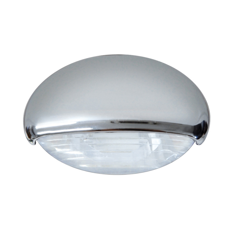 Luce di cortesia in plastica cromata e tecnopolimero stabilizzato uva 2 led, stagna IP65 a luce bianca naturale. Alimentazione 10-30V. Consumo 0,5W circa. Sensibile alla polarità