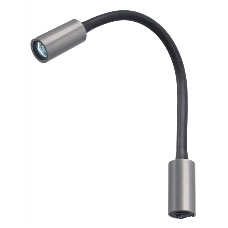 Luce da lettura flessibile, stagna IP 40 a 1 POWER LED ( 75 LUMEN ), corpo in allumunio grigio, base e testa in plastica cromata con interruttore alla base.Luce bianca naturale. Sensibile alla polarità.