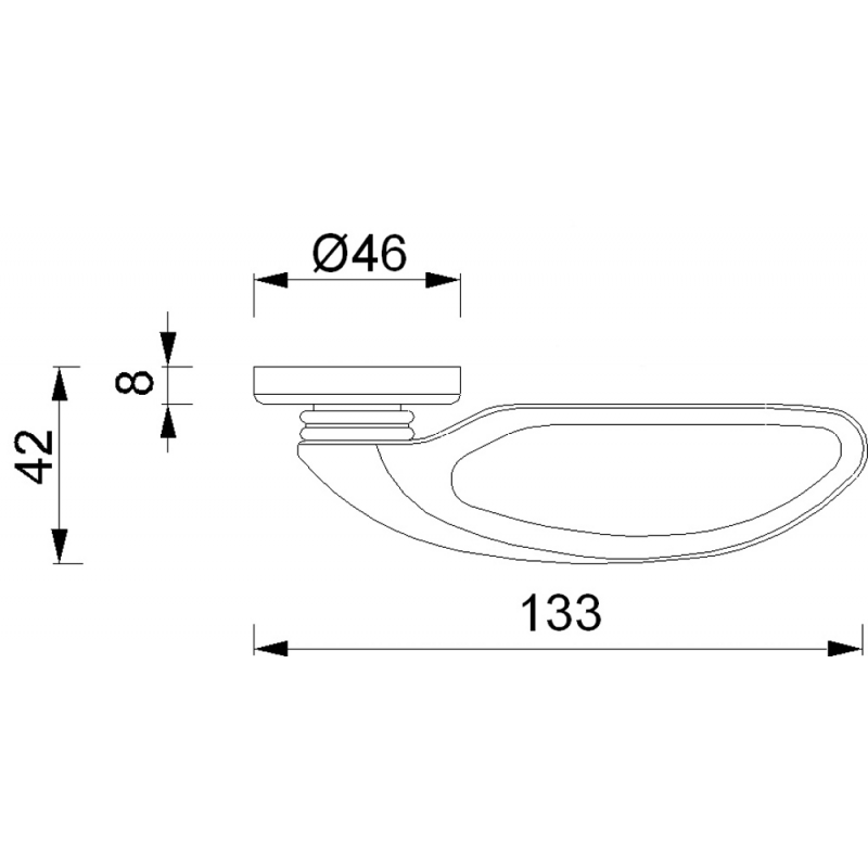 Maniglia completa di bocchetta, per rafforzare la molla della serratura e permettere il montaggio senza viti esterne. Lungh. mm. 133, sporgenza mm. 42, rosetta Ø mm. 46, quadro mm. 8.