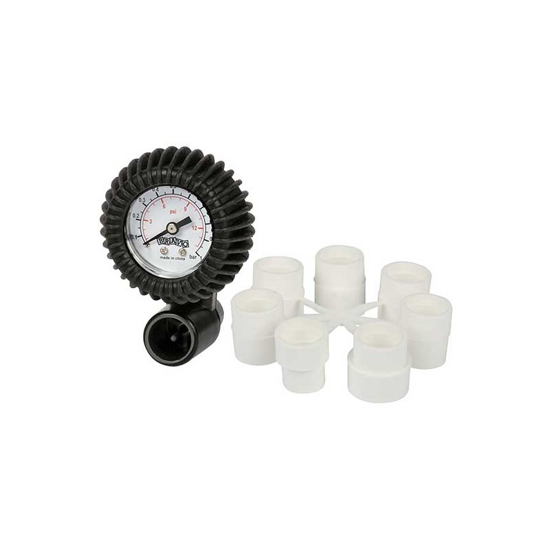 Manometro per il controllo della pressione fino ad mbar 1000. Inserito tra il gonfiatore e la valvola ne permette la lettura progressiva durante il gonfiaggio, oppure inserito direttamente nella valvola, la lettura immediata.