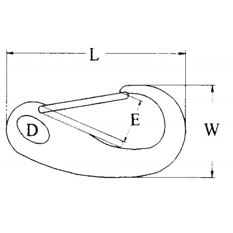 Moschettone in acciaio inox AISI 316 con apertura a molla. Dimensioni: L 50mm. W 24mm. D 6,5mm. E 10mm.