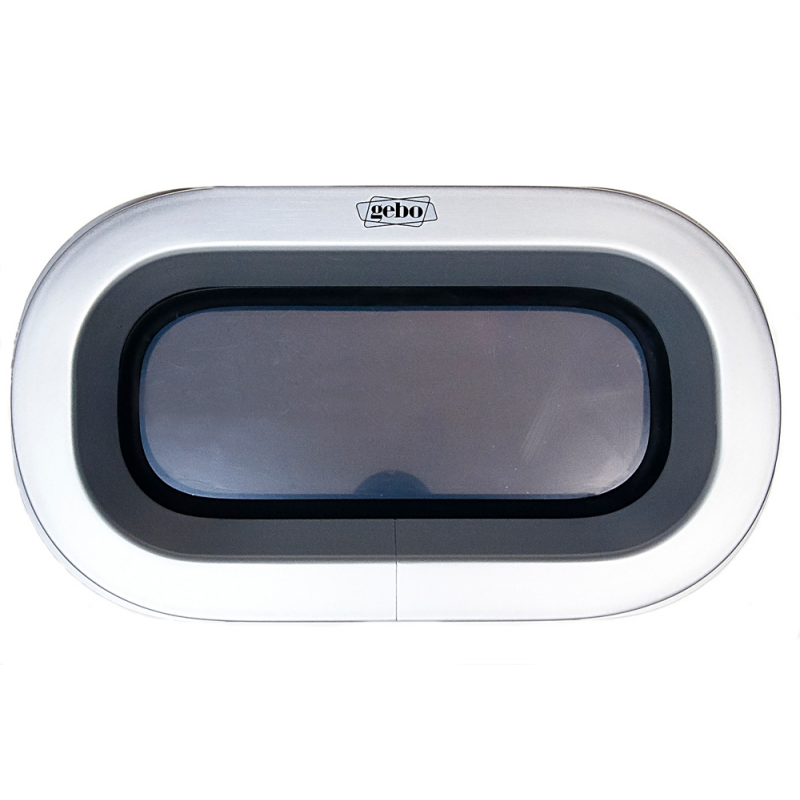 Oblò in lega leggera anodizzata , modello rettangolare, bordi arrotondati, policarbonato acrilico grigio fumé, spessore mm. 10, raggio mm. 56, semplice installazione, non richiede foratura grazie al sistema brevettato clamp. Idoneo per paratie di spessore da 9 a 21 mm. Le cerniere frizionate rendono il portello autoreggente. Il particolare bordo evita il ristagno dell’acqua.