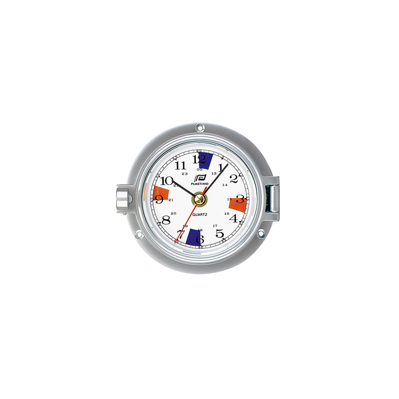 Orologio in alluminio cromato opaco con meccanismo al quarzo con zona silenzio radio, vetro minerale smussato. Modello apribile