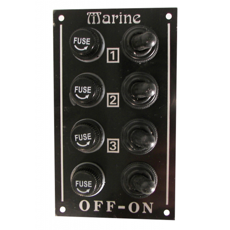 Pannello elettricoin alluminio nero con interruttori a leva protetti da cappuccioin gomma e portafusibile con fusibile in vetro da 5AMP (5x20) 3930002/5/10.