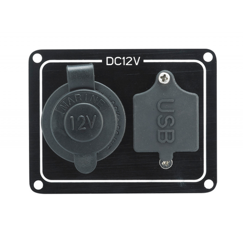 Pannello in alluminio nero stagno IP65 con presa accendisigari a 12 vdc e alimentatore usb da 5 vdc. Dim. mm. 81x62. Dim. prese accendisigariØ interno mm. 21, profondità contatto mm. 39.