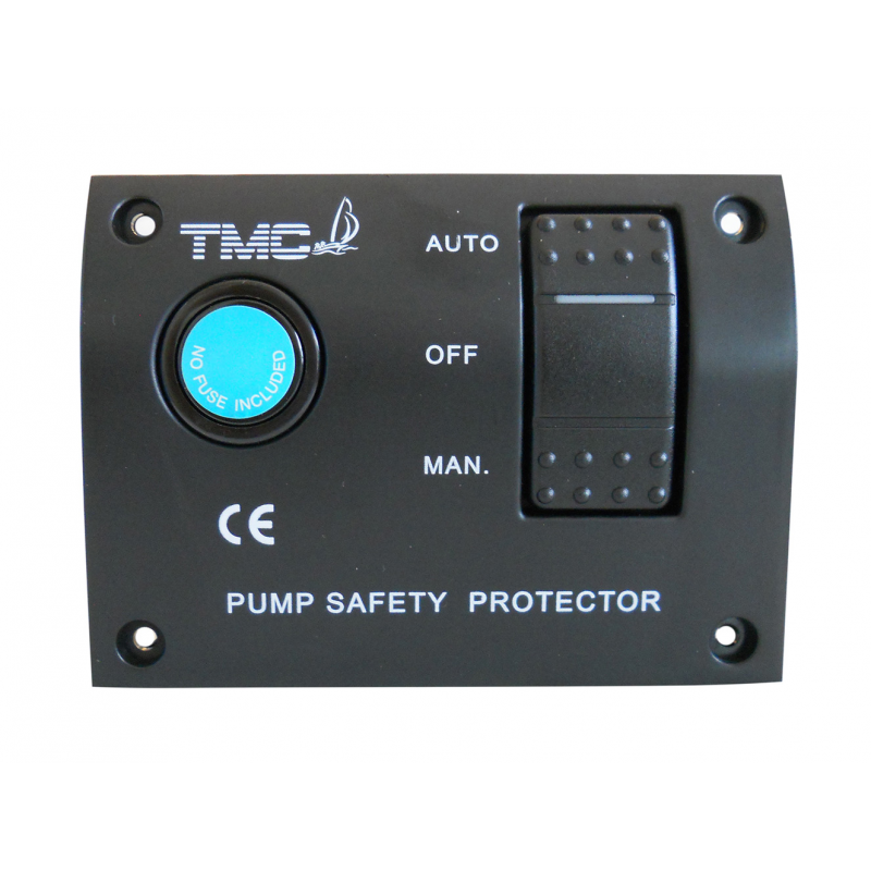 Pannello per pompa di sentina con porta fusibile e interruttore basculante con spia luminosa a 3 posizioni MANUALE-OFF-AUTOMATICO. Alim. 12V.Dim. mm. 116X87X32 prof.