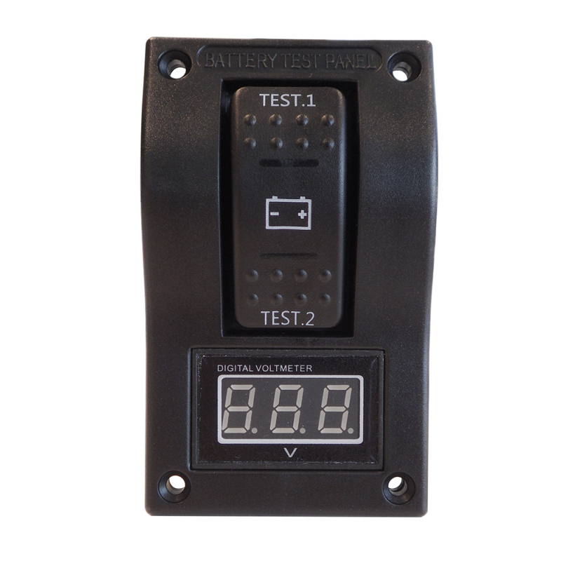 Pannello per test batterie a 12/24 vdc con voltmetro a 3 cifre di facile lettura e deviatore di selezione.Permette di verificare lo stato di 2 batterie separate o di due gruppi batterie separati.Fissaggio con 4 viti frontali.Dim. mm. 60x100