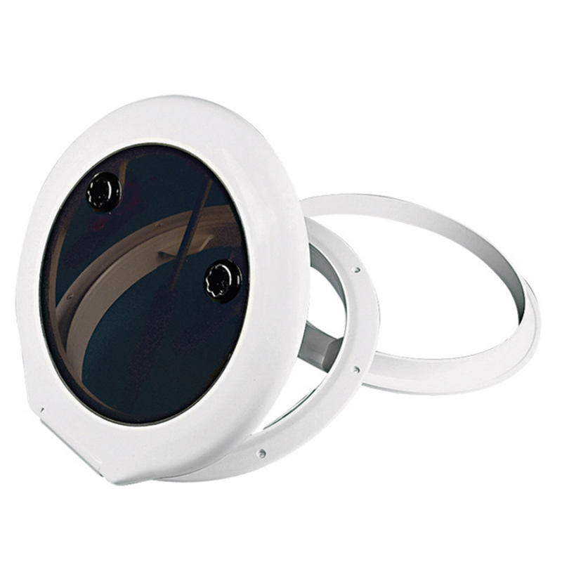 Passo uomo in ASA bianca uv resistente, lastra in plexiglass spessore mm. 8. Cornice interna di rifinitura, chiusura con maniglie, compasso telescopico con possibilità di apertura totale. Sporgenza sulla coperta mm. 27.