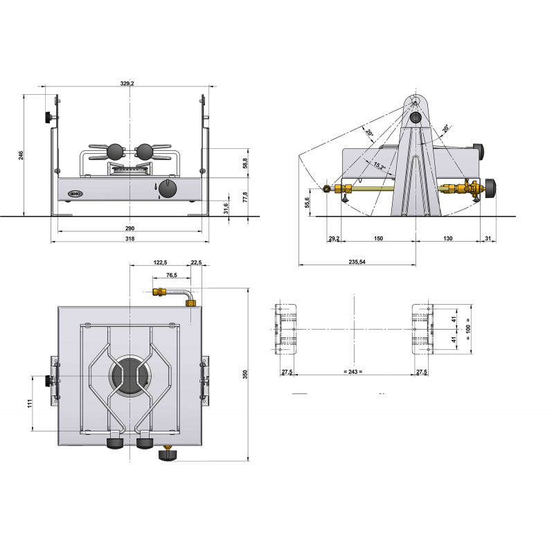 Piano cottura in acciao inox lucidato a specchio, a gas butano/propano, con parafiamma laterale, termocoppia di sicurezza e fermapentole.Omologato CE/AGA/USCG. Ugello di collegamento cucina / impianto a gas da acquistare a parte.