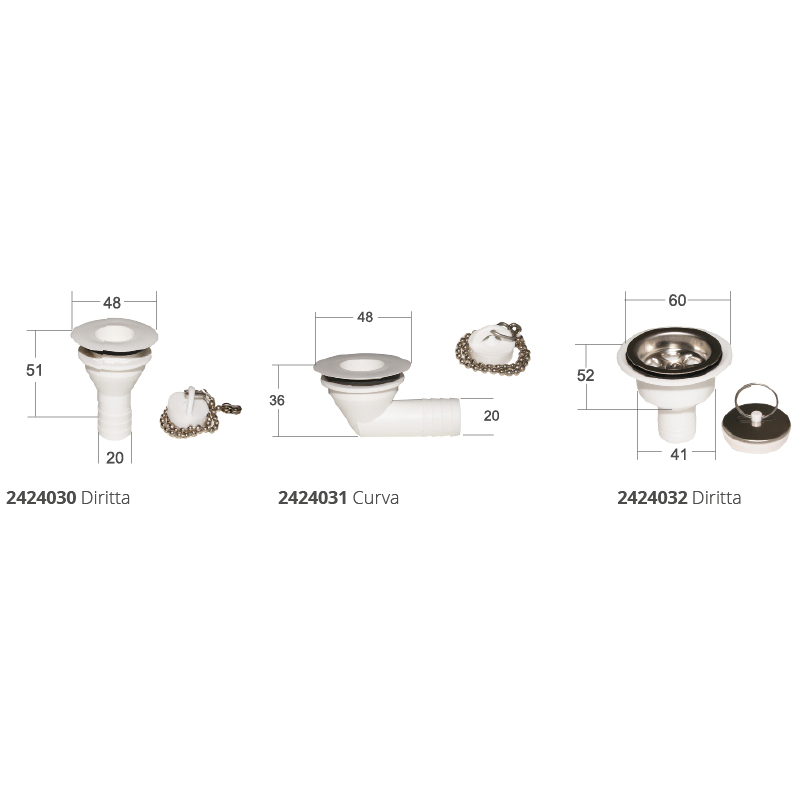 Piletta scarico Ø mm. 20 completa di guarnizione in gomma, tappo e catenella