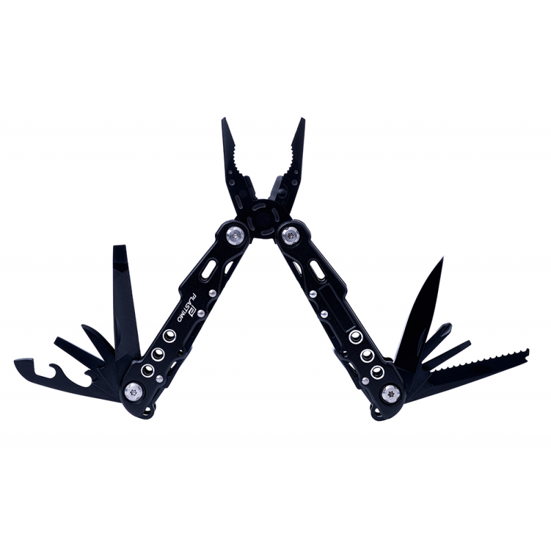 Pinza multiuso 18 funzioni in alluminio, colore nero. Utensili: apri grilli, 2 lame da 7,5 cm una dentata, una lima, coltello, apri bottiglia, slamatore, cacciavite a croce e taglio, porta punta + 9 punte cacciavite. Custodia in nylon. Lunghezza mm 155