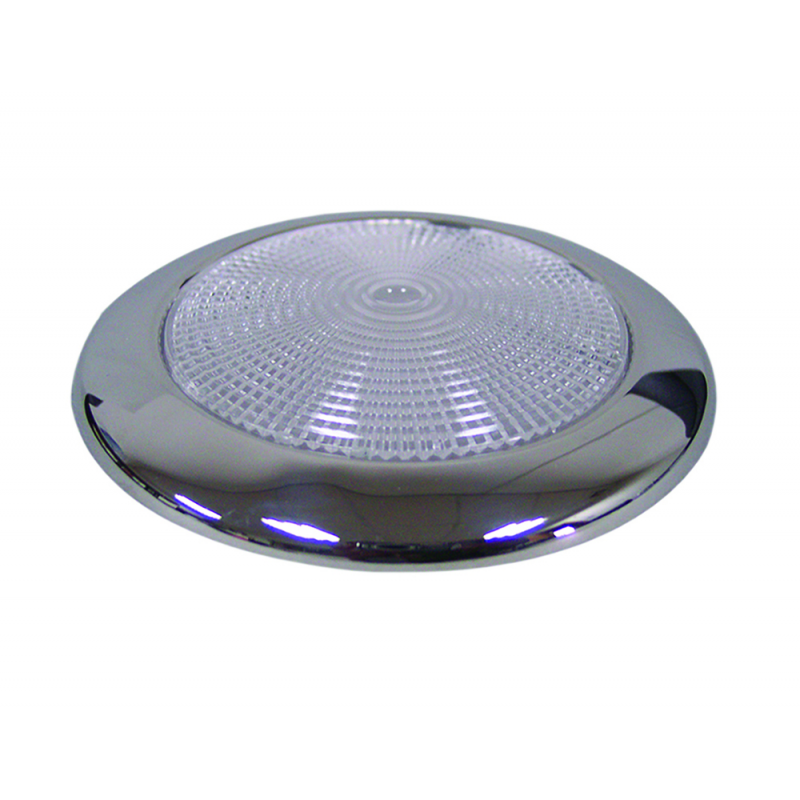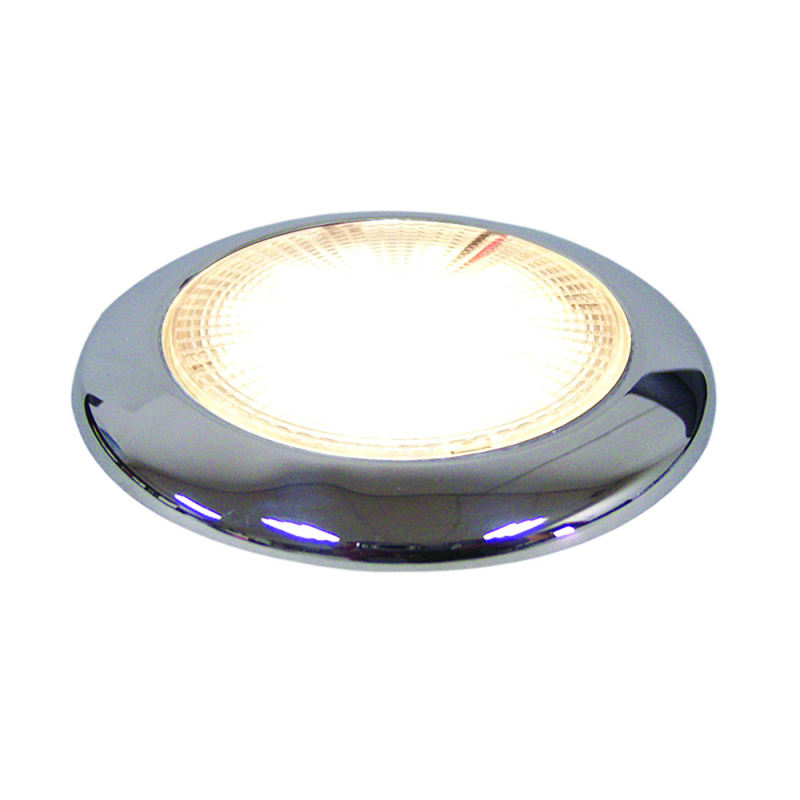 Plafonierain acciaio inox a 16 LED. Montaggio a filo con viti situate sotto il diffusore. Alim. 12V. Consumo 2,5W,illuminazione equivalente a 30W standard. IP66. Luce bianca calda (2900-3200°K) 207 lumen. Dim. Ø mm. 94x11h.