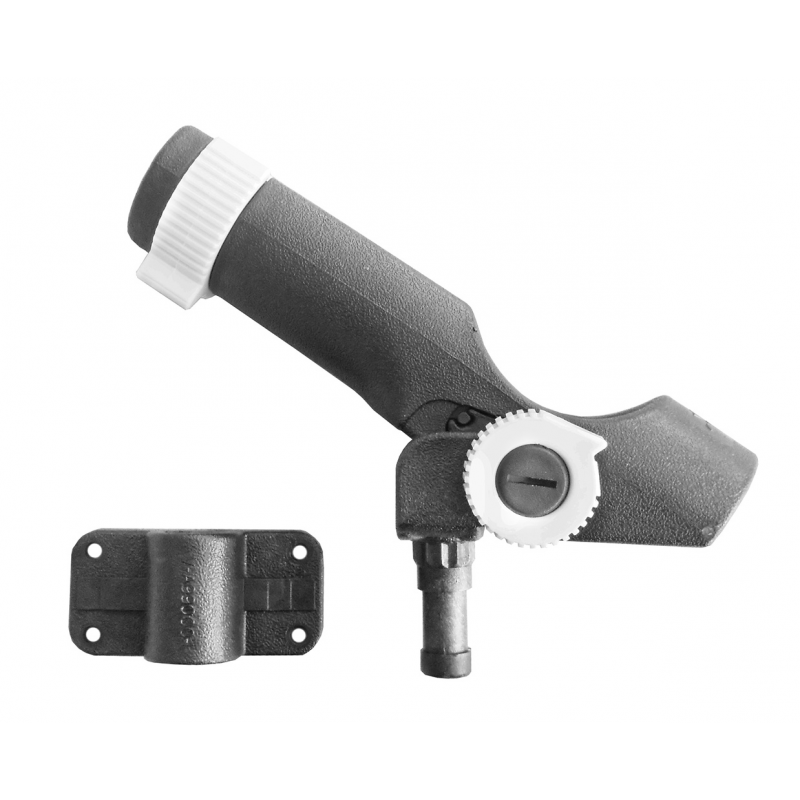 Portacanna orientabile in nylon nero, attacco a parete a baionetta. Può ruotare ed essere bloccato per 360° in senso orizzontale e per 140° dalla posizione orizzontale a quella verticale. La canna resta incastrata tramite il mulinello, nell’apposito incavo ricavato nel portacanna. Anello superiore di blocco della canna.