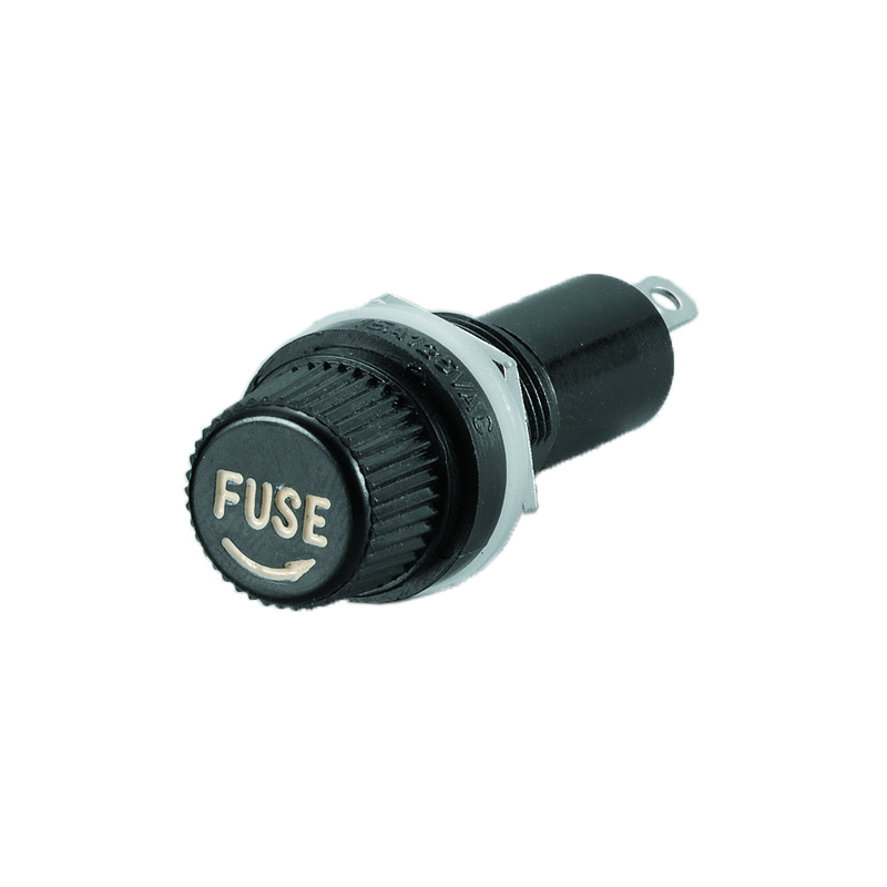 Portafusibile da incasso Max 10A, tappo a vite, contatti in ottone argentato, corpo in makrolon caricato vetro, foro Ø mm. 16. Per fusibili (art. da 3939120 a 126) in vetro da Ø mm 6,3 x lung mm 32.