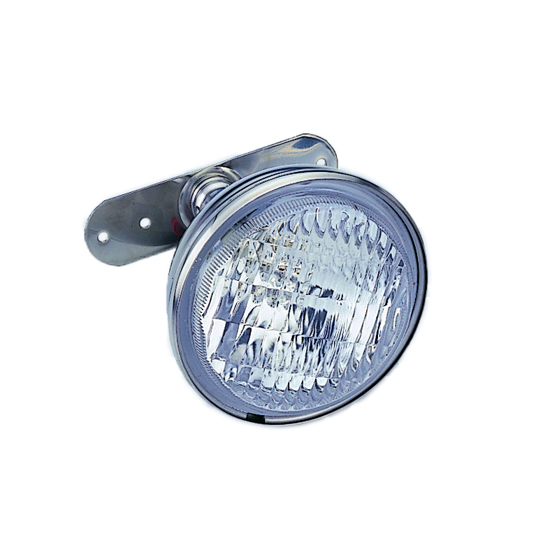 Proiettore di crocettain acciaio inox a luce diffusa con giunto sferico snodato. Dim. parabolaØ mm. 100, alt. mm. 120. Completo di lampadina alogena H3 55W 12 V.