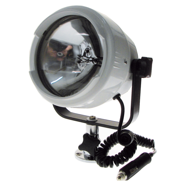 Proiettore in ABS con base cromata. Altezza mm. 250. Orientabile e sfilabile dalla base con cavo estensibile fino a mt. 2. Completo di spina. Bulbo Ø mm. 125 a doppio filamento 100+100 W, luce corta a fascio largo (mt. 100),luce di profondità a fascio stretto (mt. 600). Alimentazione 12 V.