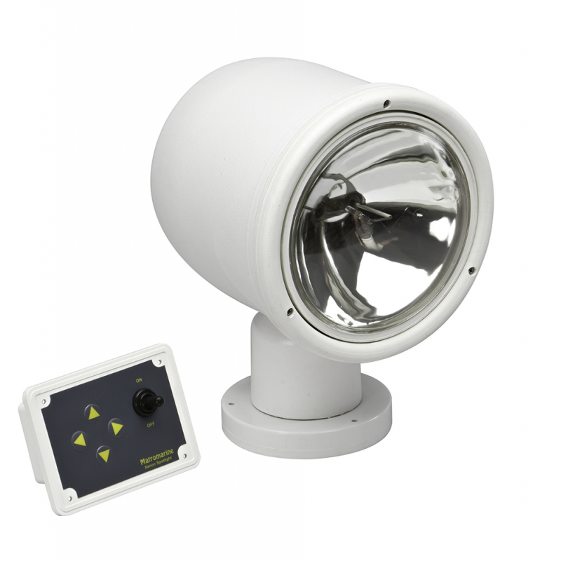 Proiettore elettrocomandato in ABS resistente ai raggi UV. Completo di pannello di comando multifunzione. Ottima resistenza alla corrosione anche in condizioni climatiche avverse. Ampio fascio largo e stretto, che raggiunge una distanza di mt.300 (ad 1 LUX), grazie ad un bulbo con lampada alogena da 100W, con potenza di 150.000 candele, per la massima sicurezza e visibilità.