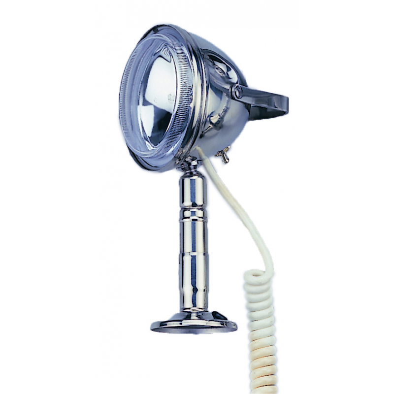 Proiettore in acciaio inox, da coperta estraibile e orientabile a mano, lampadina alogena 55 W 12 V. Dim. parabola Ø mm. 110, H mm. 225.