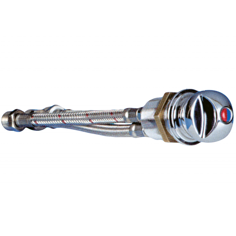 Rubinetto miscelatore in ottone cromato, acqua calda/fredda, per doccia separata. Sporge per 40 mm e si apre inclinando la manopola. Completo di 2 flessibili da 3/8"