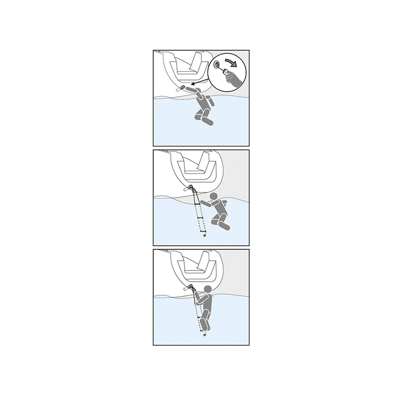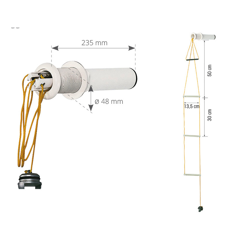 Scaletta di sicurezza ad incasso composta da 3 gradini in polipropilene e da una maniglia in acciaioinox uniti da una cima Ø mm. 3. La scaletta è collocata in un tubo in poliammide chiuso da un tappo grigio per una perfetta tenuta stagna. Si installa ad incasso, a poppa o di fianco appena sopra la linea di galleggiamento.