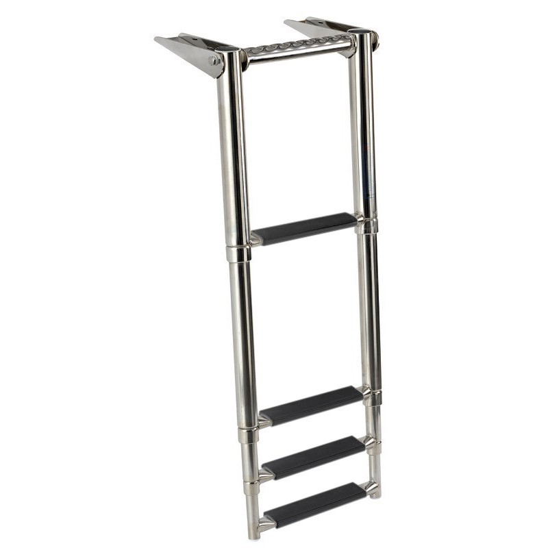 Scaletta telescopica e ribaltabile in acciaio inox AISI 316. Applicazione sopra la plancetta. Gradini con pedana antiscivolo in plastica nera, elastico ferma gradini.