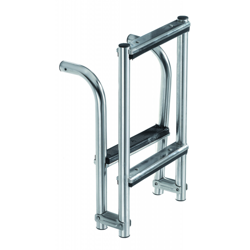 Scaletta pieghevolein acciaio inox, Ø tubo mm 25 con attacchi a 90° e gradini antiscivoloin plastica nera. Ideale per montaggio in verticale per specchipoppieri. Munita di distanziatori regolabili all'altezza desiderata. Per rendere sfilabili le scalette ordinare articolo 3030350 attacco in acciaio inox, venduto a coppia