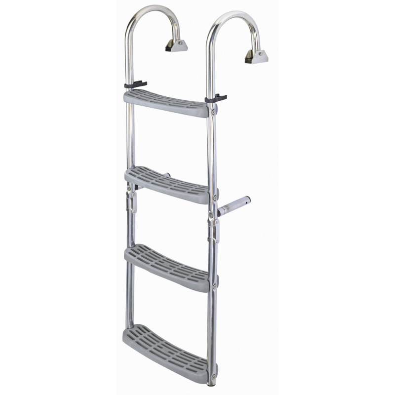 Scaletta pieghevole e ribaltabilein acciaio inox AISI 316, Ø tubo mm 22, attacchi arcuati a 180° e gradini in plastica antiscivolo. Curva di attacco mm 185. Ideale per montaggio inverticale per specchi poppieri. Munita di distanziatori fissi.
