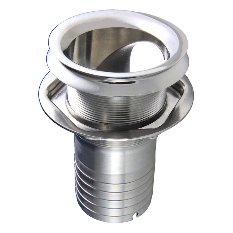 Bocchettone scarico motore in acciaio inox AISI 316, con paletta per evitare il riflusso dell’acqua verso il motore. Bordo esterno con scanalatura per evitare all’acqua di scarico del motore di sporcare la poppa della barca. Completo di controflangia per il fissaggio.