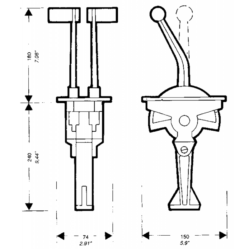 Scatola di comandobileva ad azione singola, gas + invertitore leve inclinate. Ogni leva controlla separatamente il cavo del gas o dell’invertitore. Adatta a qualsiasi tipo d’imbarcazione con motore fuoribordo, entrobordo e gruppi poppieri provvisti d’invertitore idraulico. L’applicazione ad incasso la rende particolarmente adatta all’installazione su flying bridge dove maggiore é I’esposizione agli spruzzi marini. Realizzata in alluminio pressofuso con leve cromate. La leva dell’accelleratore é dotata di frizione e quella dell’invertitore di scatti per avvertire correttamente la posizione di marcia avanti, folle e marcia indietro. Sia la frizione che gliscatti sono inseribili e regolabili dall’esterno. Mediante I’interruttore di sicurezza X12 (optional), I’avviamento del motore si ottiene solamente con I’invertitore in posizione di folle. E’ disponibile con leve inclinate o con leve diritte. I modelli B58 e B59 sono provvisti di un blocco di sicurezza che impedisce manovre accidentali dell’invertitore quando il motore é accelerato. Utilizza i cavi C2 - C8 - Mach Zero - 33C. Percavo C22 kit K22 art. 4242063.