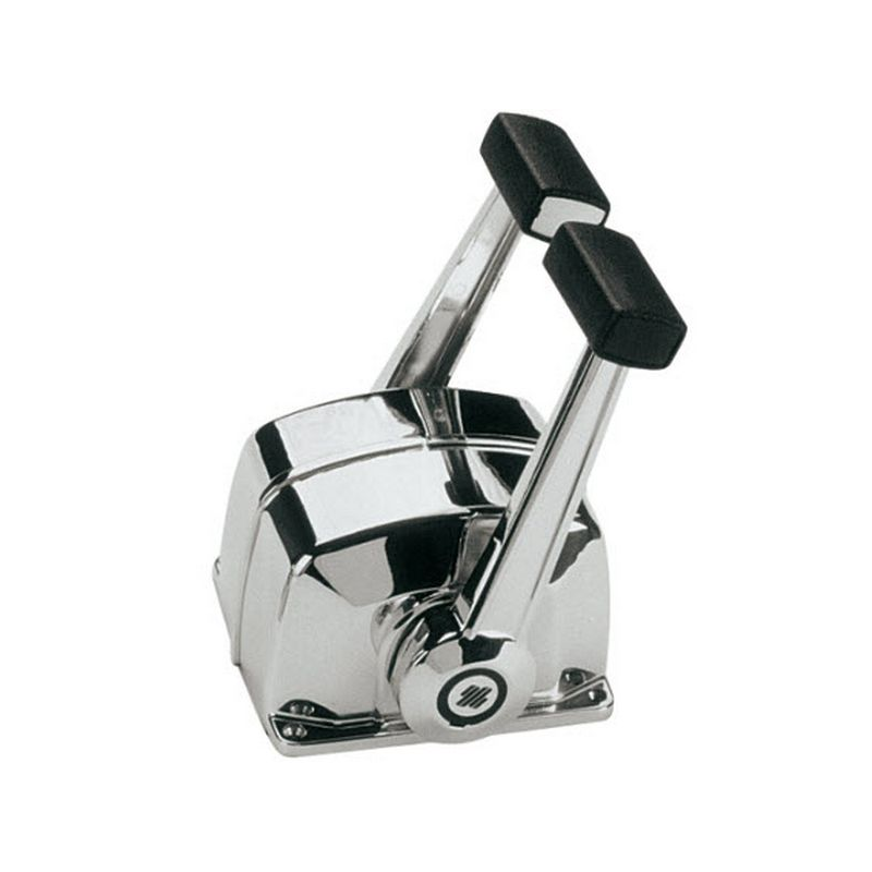 Scatole di comando versione bileva per due motori ad azione doppia per il controllo del gas e dell’invertitore. Adatte a qualsiasi tipo d’imbarcazione con motore fuoribordo, entrobordo e gruppi poppieri provvisti d’invertitore idraulico. Rendono più facile e sicura la guida evitando automaticamente I’innesto dell’invertitore se il gas non é al minimo. Sono realizzate in alluminio pressofuso, verniciate o cromate. Tirando fuori la leva si disinnesta I’invertitore durante I’operazione di riscaldamento del motore. Mediante I’interruttore di sicurezza X12 (optional), I’avviamento del motore si ottiene solamente con I’invertitore in posizione di folle. I modelli con trim presentano nell’impugnatura un interruttore che permette la regolazione dell’alzo piede dei motori fuoribordo e nei gruppi poppieri. Utilizzano i cavi per il comando motore C2-C8-C14 e Mach 0-14. Con il cavo C5-C16 e Mach 5 occorre il kit di adattamento K35 art. 4242069.