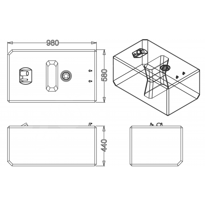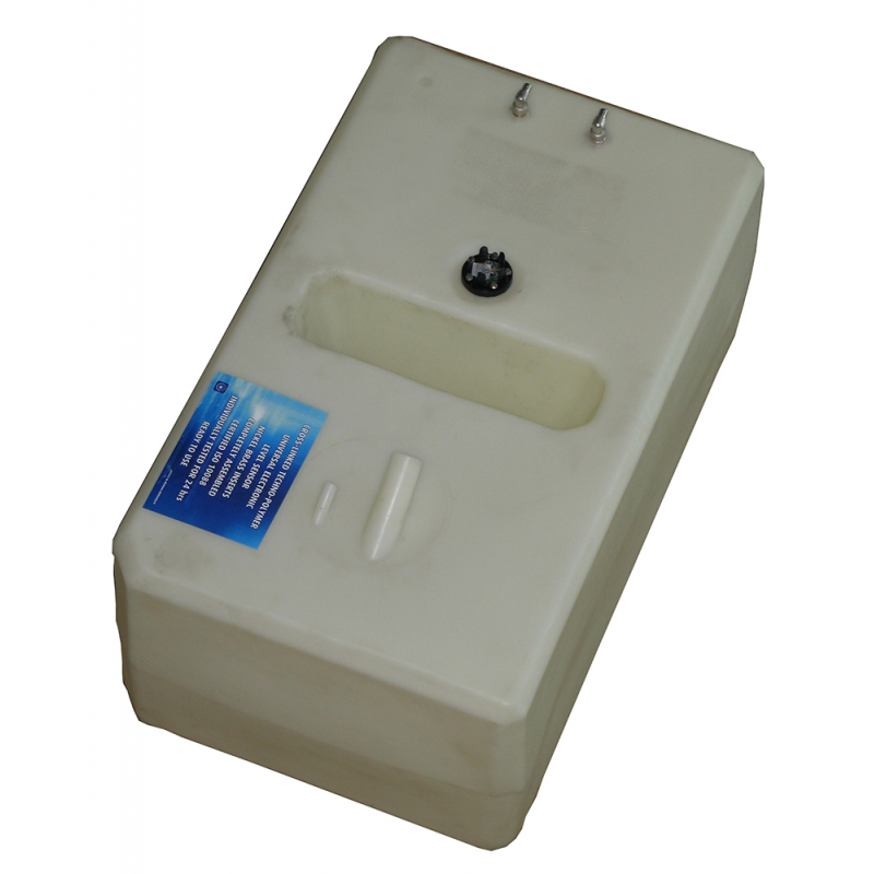 Serbatoio rigido per carburante costruito in polietilene reticolato di colore neutro, certificato CE in accordo con la direttiva 94/25/CE secondo normativa 10088 e ISO 21487. Provvisto di sensore di livello universale, può funzionare o a 10-180 ohm o a 240-33 ohm.Inserti per imbarco, sfiato Ø mm. 16, pescante e ritorno Ø mm. 12. Ogni serbatoio è collaudato singolarmente.