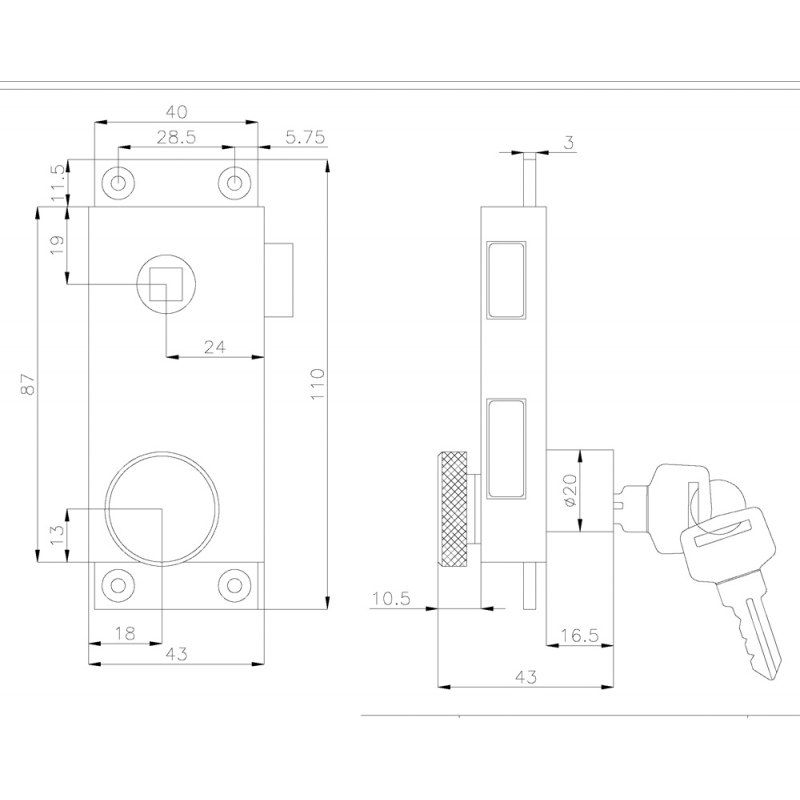 Serrature in ottone cromato quadro mm. 8 da appoggio, con cilindro all’esterno e pomolo all’interno, mm. 110x43