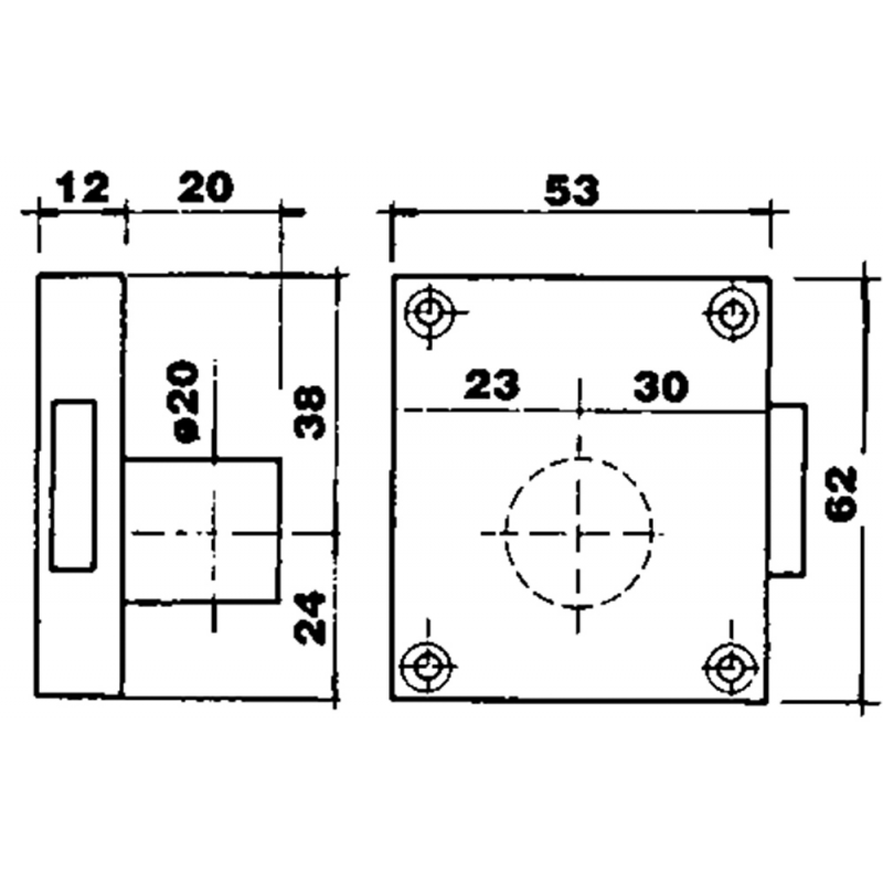 Serrature in ottone cromato da appoggio a due mandate, misura mm. 60x53,cilindro Ø mm. 20, sporgenza cilindro mm. 22, quadro mm.8
