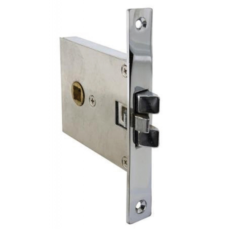 Serratura da incasso in ottone cromato a scrocco antivibrante. Incasso mm. 70x60x10. Mostrina mm. 110x16x2. Quadro mm. 8.