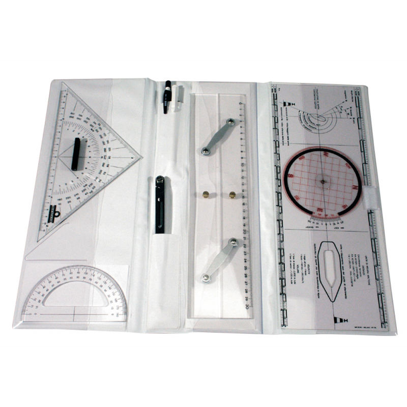 Set carteggio raccolto in una pratica custodia in plastica elettrosaldata composto da: parallela a snodo, squadra nautica, goniometro, tracciatore di rotta, compasso, matita e gomma.