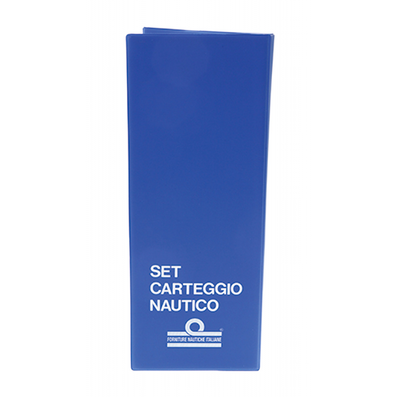 Set carteggio raccolto in una pratica custodia in plastica elettrosaldata composto da: parallela a snodo, squadra nautica, goniometro, tracciatore di rotta, compasso, matita e gomma.