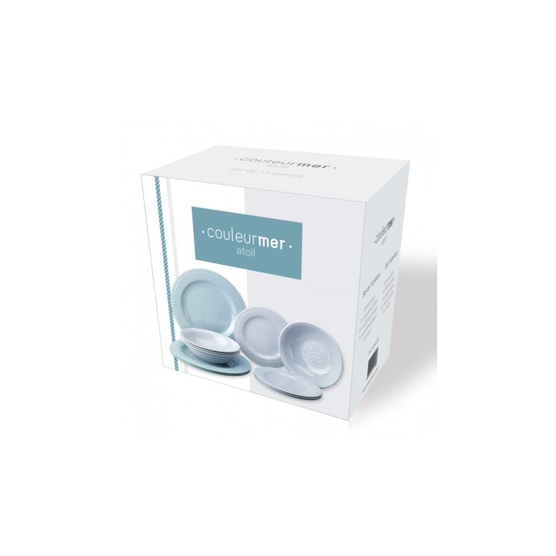 Stoviglie realizzate in melamina colorata. Scatola da 12 pezzi contenente:4 piatti piatti Ø cm.28, 4 piatti fondi Ø cm.20, 4 piatti da dessert Ø cm. 20