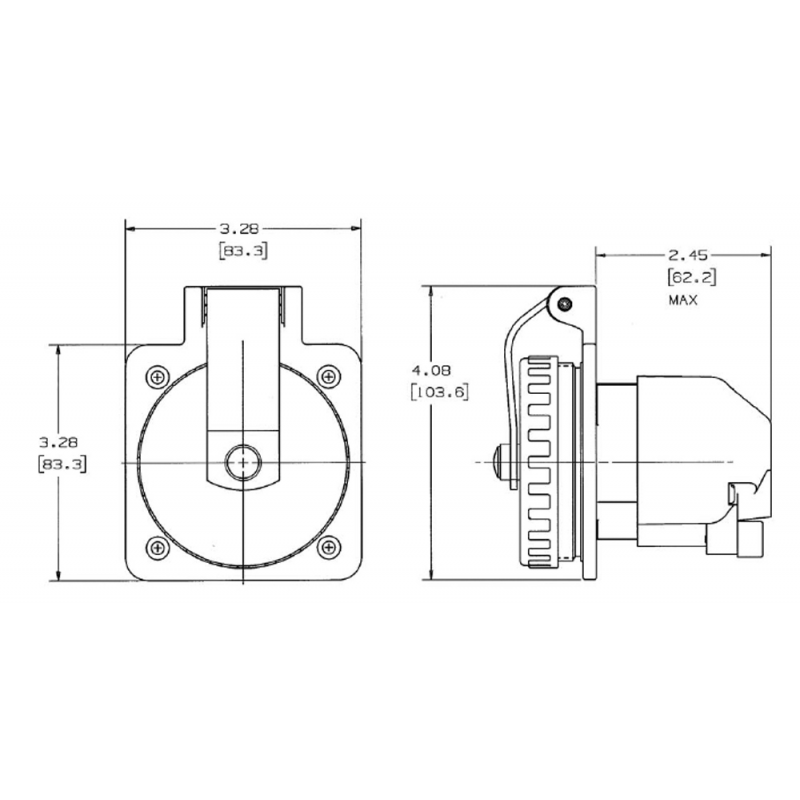 Spina ad incasso corpo in acciaio inox AISI 316, stagna quando è chiusa, cappuccio di protezione posteriore in ABS. A Norme CEE. Per Il collegamento della Corrente dalla Banchina alla Barca.