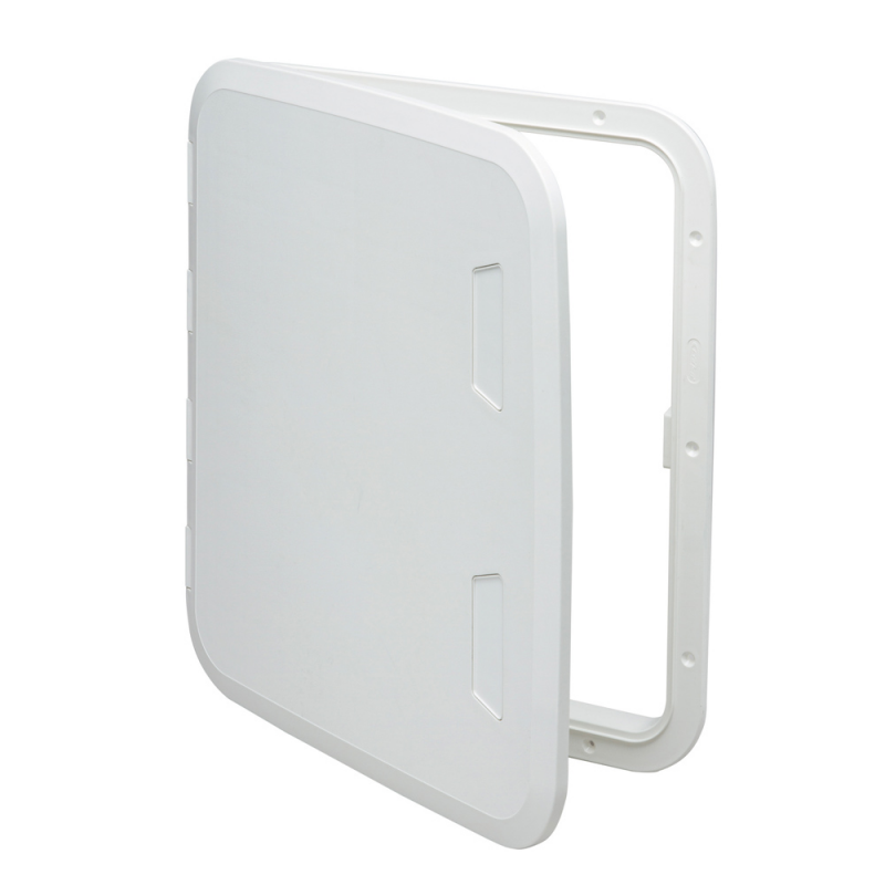Sportello in ASA, colore bianco , resistente ai raggi UV, apribile a 180° con maniglia push-pull e chiusura a scatto. Montaggio verticale
