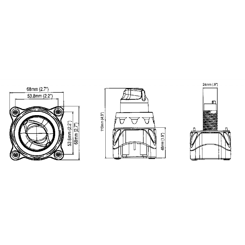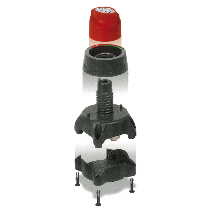 Stacca batteria BEP con manopola estraibile ruotandola di 45° in senso antiorario. 275 AMP in servizio continuo, 1250 AMP di spunto. Montaggio in piano o ad incasso mediante la ghiera filettata fino a 19 mm. di spessore. Terminali di collegamento: 2x10 mm.