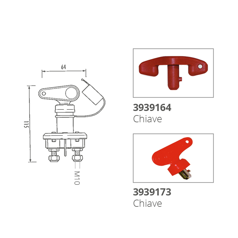 Stacca batteria unipolarecon chiave estraibile. 140 Amp servizio continuo, 2000 Amp/3 secondi. ConformeUNI EN 28846. Esecuzione in materiale plastico, contatti inrame argentato. Fissaggio su flangia Ø mm. 64.
