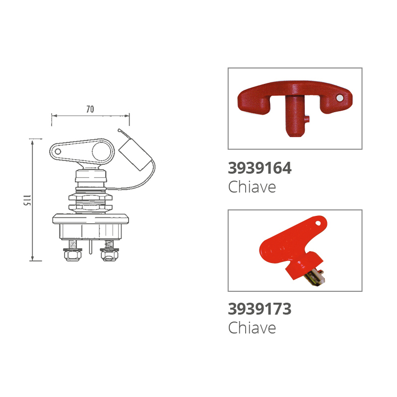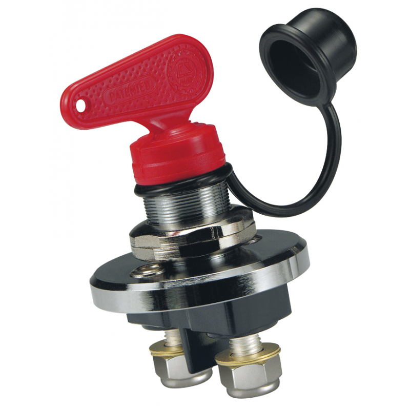 Stacca batteria unipolare con chiave estraibile, 140 Amp servizio continuo, 2000 Amp/3 secondi. Esecuzione mista in materiale plastico e ottone cromato, contatti in rame argentato. Fissaggio su flangia Ø mm. 70, oppure su cilindro Ø mm. 27 con dado e controdado.