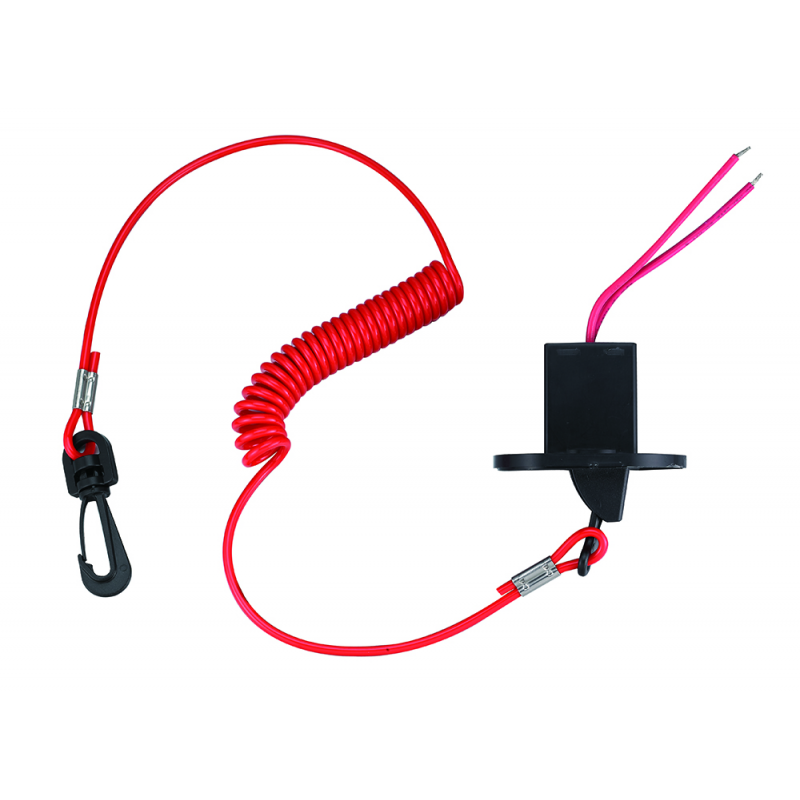 Stacco automatico di sicurezza a clips sfilabile. Stagno IP65, con cavetto a spirale. Interrompe il circuito in caso di caduta fuoribordo del pilota. 12 Vdc 10A.