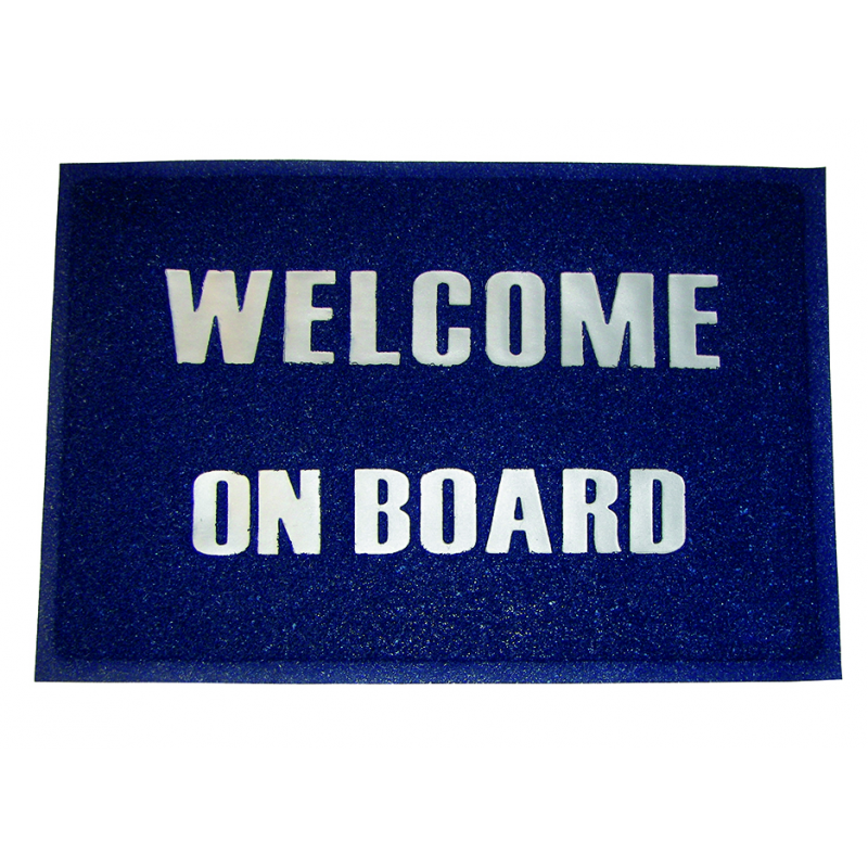 Stuoino “Benvenuto” in morbido e resistente PVC antiscivolo, antiolio, benzina, acqua di mare e raggi U.V. Lo strato superiore è costruito per intrappolare lo sporco e la polvere. Per la pulizia utilizzare un aspirapolvere, sbattere o lavare con detergenti non aggressivi. Colore Blu. Dim. mm 600x400