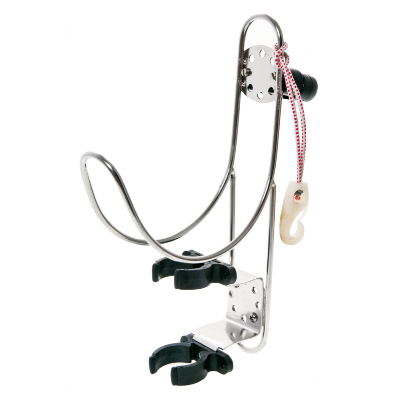 Supporto in acciaio inox per salvagente anulare o a ferro di cavallo, con portaboetta.Si può installare su piano, a parete oppure su tubo Ø mm. 22/25, tramite apposito morsetto art. 1011001 incluso. Per anulare art. 1010004/8/9 e boetta art.1040835.