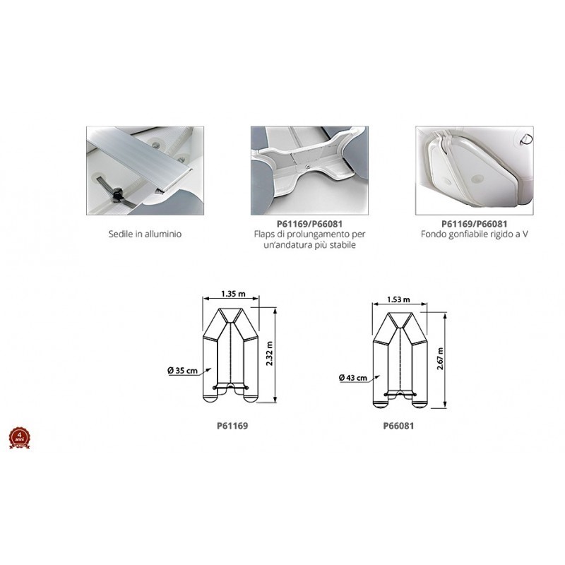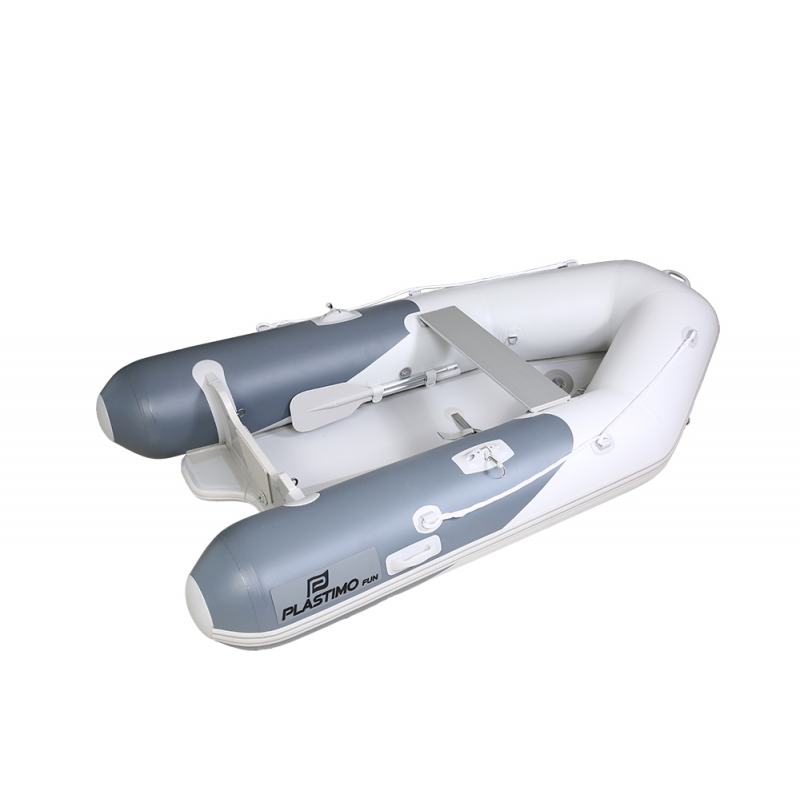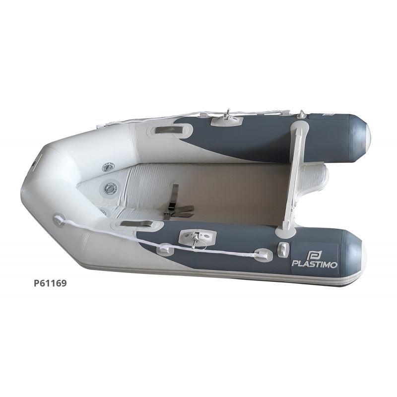 Tender Plastimo stabile e leggero, munito di una carena a V, pagliolo gonfiabile, flap ed anelli di rimorchio. Adatto per nr. 2 adulti ed un bambino e ad un carico massimo di 380kg., diametro dei tubolari cm.35, due comparti con sedile in alluminio, dotato di supporto per tanica più cinghia, sacco per trasporto, kit di riparazione, gonfiatore, 2 pagaie. Potenza massima del motore 3,67kw (5HP) . Dim.cm. 232 x 135 x 65, peso kg. 18