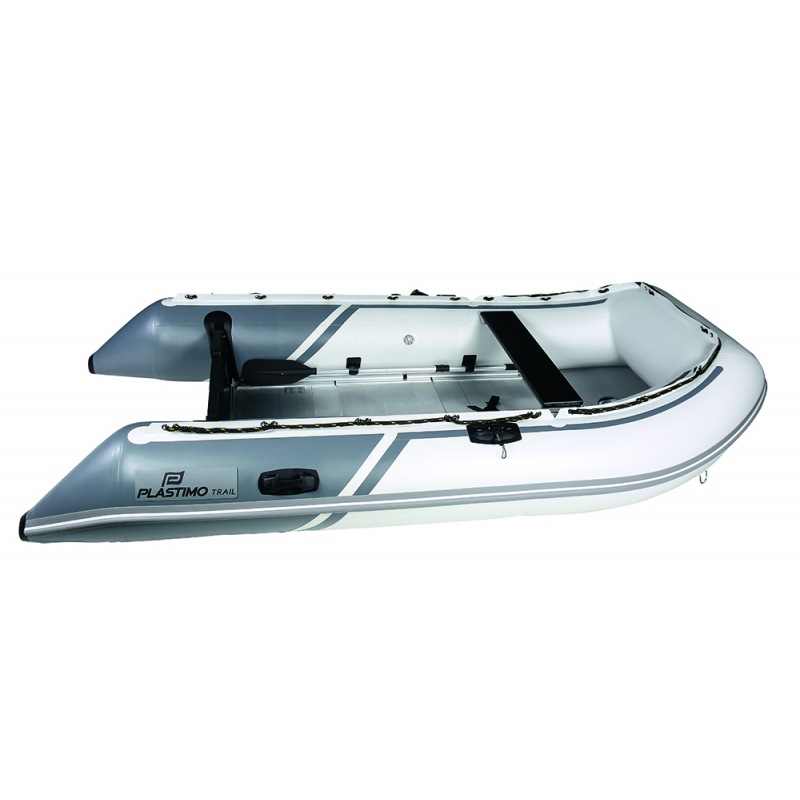 Tender Plastimo munito di una carena a v gonfiabile, adatto per tre persone adulte ed un bambino, carico massimo di 500kg.,diametro dei tubolari cm.44, 3+1comparti con sedile in legno grigio, dotato di sacco per trasporto, kit di riparazione, gonfiatore e due pagaie. Potenza massima del motore 7,4 kw.Dim.cm. 272 x 158 x 74,peso kg.49