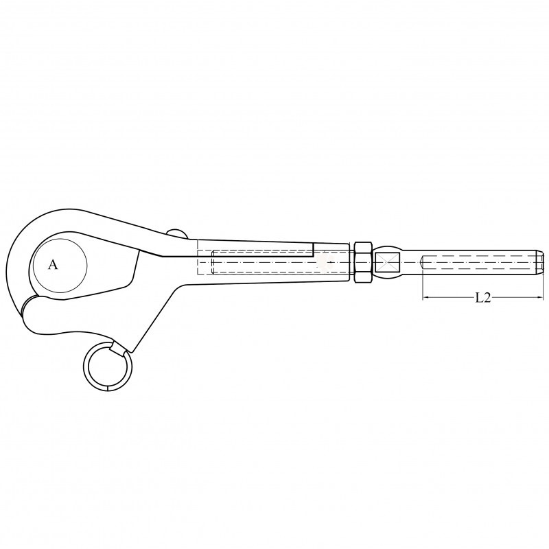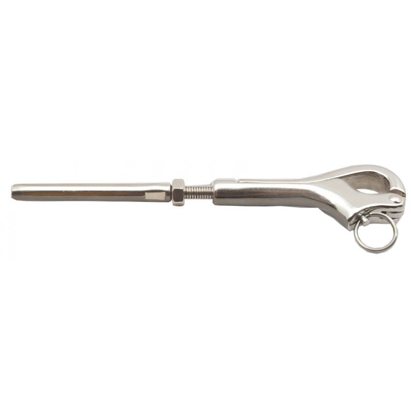 Tenditore in acciao inox 316 con gancio a pellicano per battagliola apribile e con terminale a pressare per fune inox.